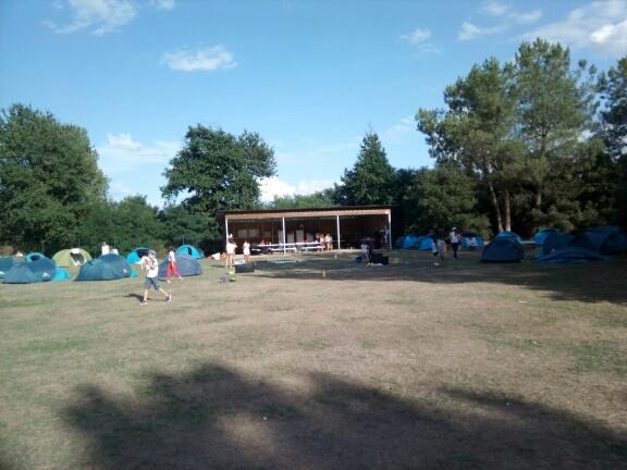 Terrain de 5000m² équipés de sanitaires, douches, bacs à vaisselle et d’un préau collectif avec tables et réfrigérateurs.